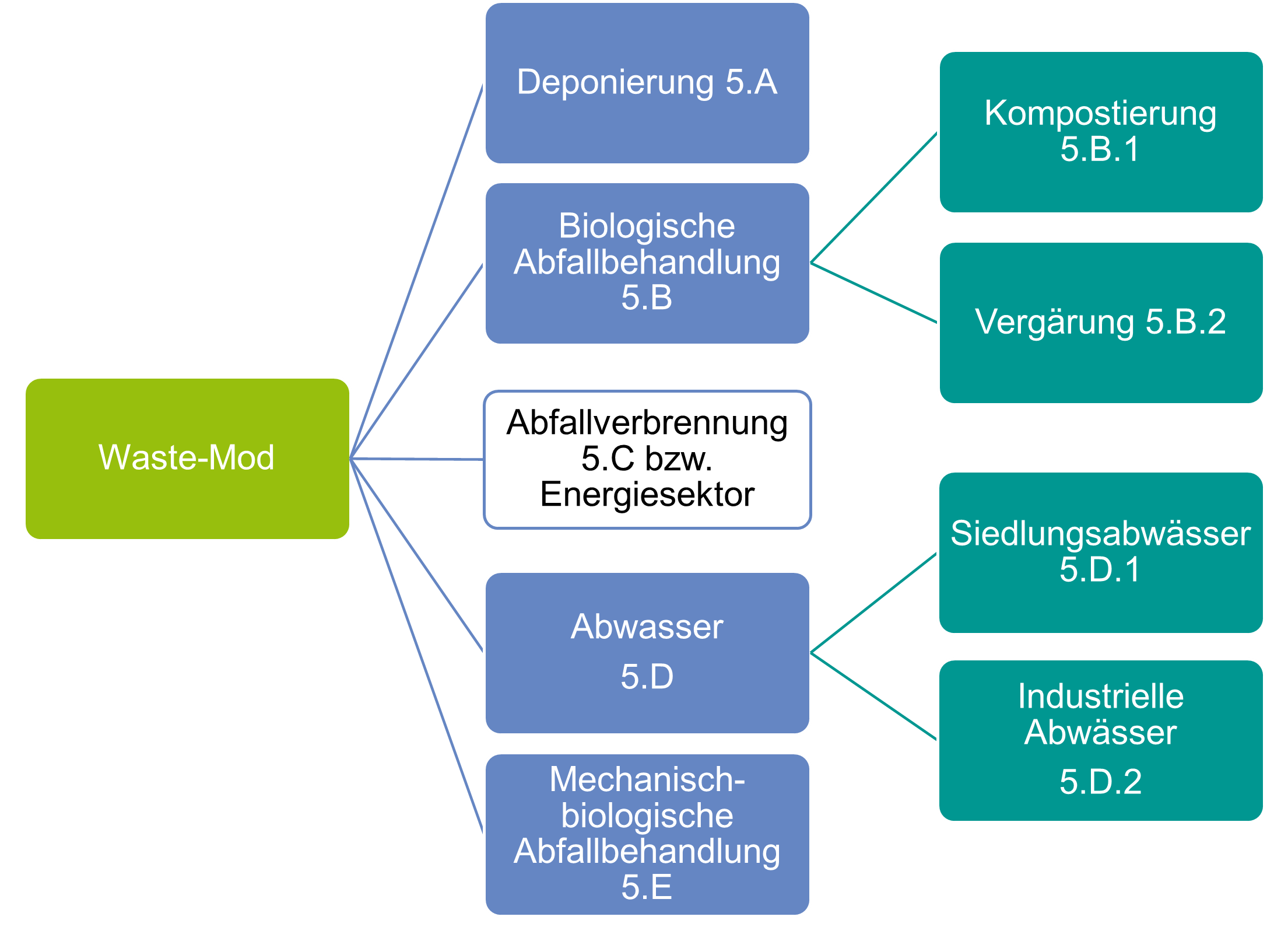 Waste-Mod ist ein modulares Abfallmodell, welches auf Basis von 4 Modulen die Emissionen aus der CRT-Quellkategorie 5 (nicht-energiebedingte Emissionen des Abfallsektors) abbildet. Die vier Module des Modells decken die relevanten Quellkategorien