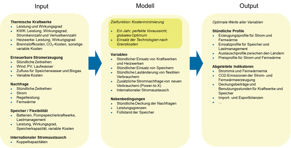 Detailliert abgebildet ist die Interaktion zwischen Strom- und Fernwärmesektor: KWK-Anlagen, Heizwerke sowie erneuerbare und elektrische Wärmeerzeuger werden verschiedenen Bilanzräumen zugewiesen, in denen jeweils zu jedem Zeitpunkt Erzeugung und Nachfrage von Wärme ausgeglichen werden müssen. Innerhalb eine Bilanzraumes können wie Wärmeerzeuger entsprechend ihrer Grenzkosten kostenminimierend eingesetzt werden. Bei KWK-Anlagen wird dabei berücksichtigt, dass durch die Auskopplung von Wärme der elektrische Wirkungsgrad der Anlage sinkt. Durch die Kopplung von Strom- und Wärmesektor wirken sich Strompreiseffekte direkt auf die Deckung der Fernwärmenachfrage aus.